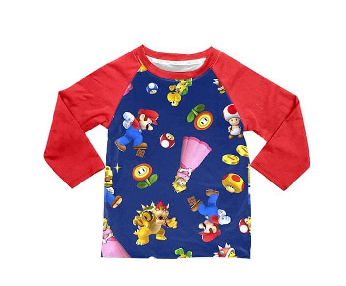 Video game shirt is made of soft milk silk and matches our Mario dress. Runs slim, consider sizing up for loose fit.